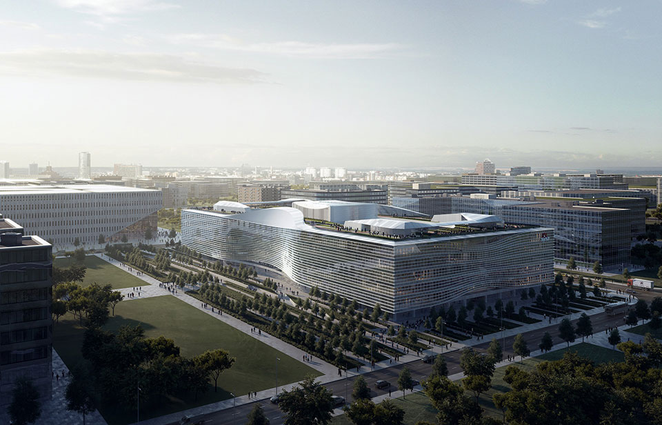 規劃以無限'∞’為平面概念,結合2 個內庭空間創造出經典的圍合庭院式總部辦公的空間格局。Aedas設計了位處整體規劃中央的'新浪之眼’,作為主要的垂直交通樞紐,同時作為傳遞資訊、文化與技術交流的互動空間,表達宏觀的企業精神。